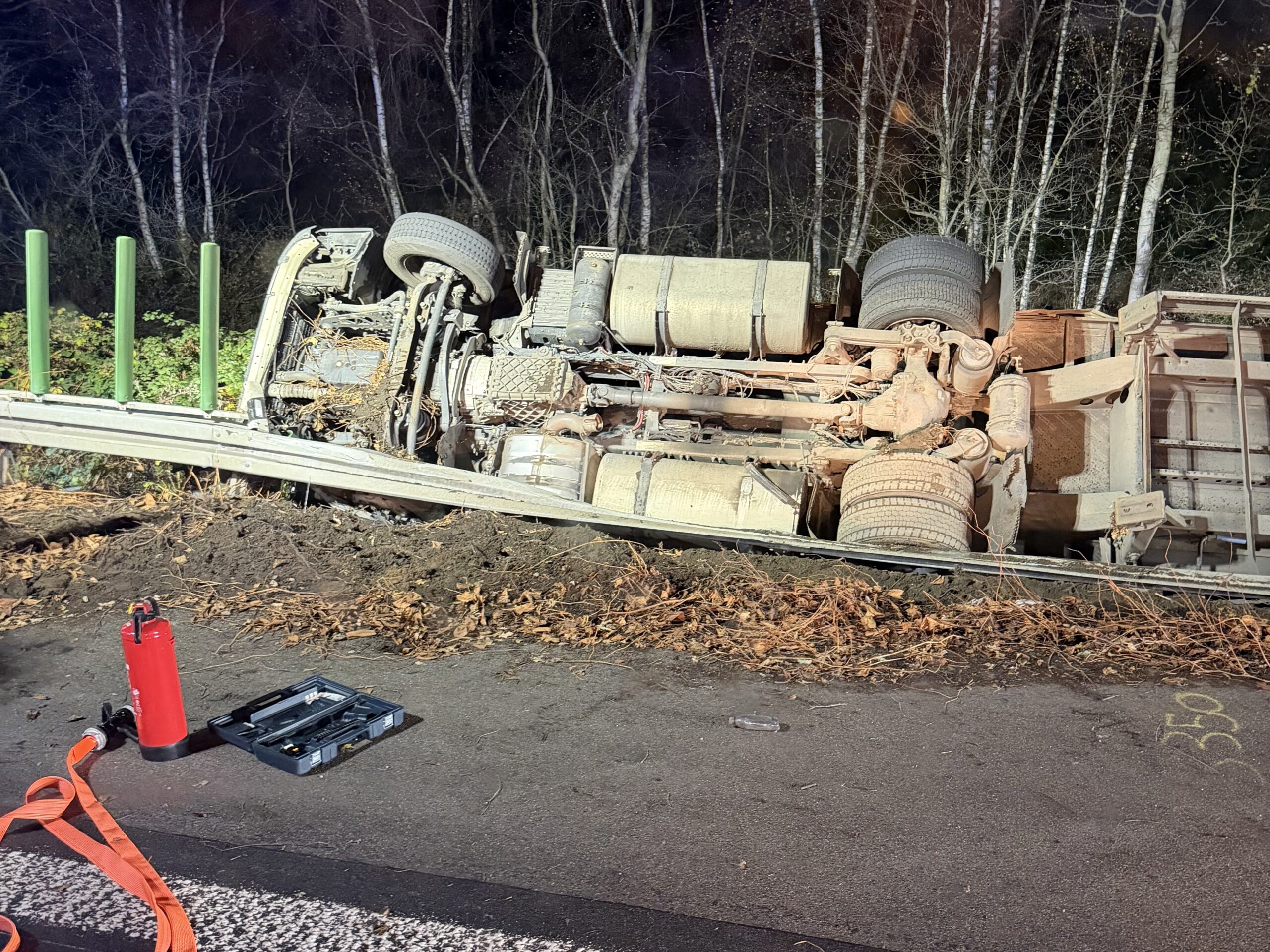Auf dem Autobahnabschnitt zwischen der Anschlussstelle Moers-Nord und dem Autobahnkreuz Kamp-Lintfort war aus ungeklärter Ursache ein Sattelzug von der Fahrbahn abgekommen und rechts neben der Autobahn in den Graben gestürzt.